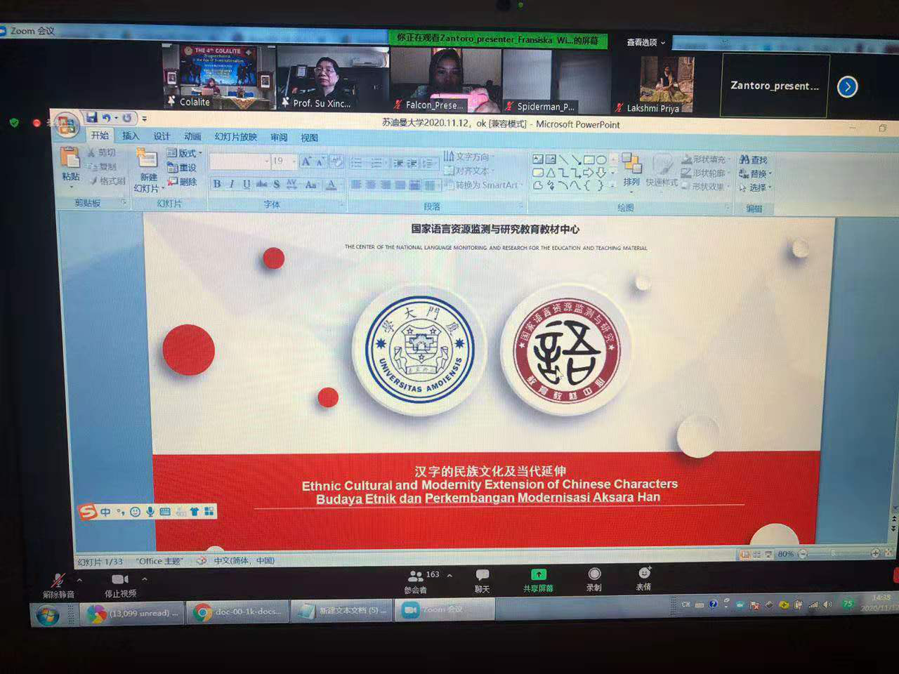 2020年11月12日,由印度尼西亚公立大学苏迪曼将军大学主办语言学与文学国际研讨会线上召开,我校教育教材中心主任苏新春教授作为主讲嘉宾在会上作了题为“汉字的民族文化及当代延伸”的报告, 中心2016级印尼博士研究生黄世友(Fransiska Wiratikusuma)担任会场翻译,并在小组讨论环节中口头演讲:“Practical values of a Thesaurus of Modern Chinese in Chinese language learning”的报告。
