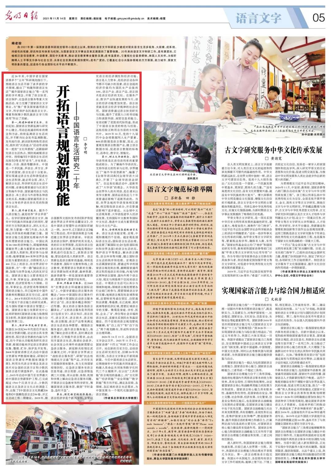 近20年来,中国学者在国家语委多个“五年”科研规划指引下,围绕语言生活开辟了诸多新的学术领域,提出了“构建和谐语言生活”“提升国家语言能力”等一系列新的学术理念,开展了语言扶贫、语言保护、应急语言服务等重大实践活动,有力支撑了国家语言文字事业,为“推广普及国家通用语言文字,科学保护各民族语言文字,尊重和保障少数民族语言学习和使用”作出了贡献。