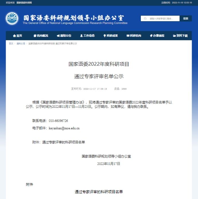 11月17日,国家语委科研规划领导小组办公室公布了国家语委2022年科研项目名单,我中心共有4项项目获立项公示,其中重点项目1项,国家语委研究基地重点项目1项,国家语委中青班一般项目2项,立项信息如下: