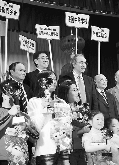 法国华文教育协会首届中文学校演讲朗诵比赛于2006年4月2日在巴黎的潮州会馆礼堂举行。中国驻法大使赵进军(左二)、法国中文教育总督察白乐桑(左三)以及法国侨领为孩子们发奖。
