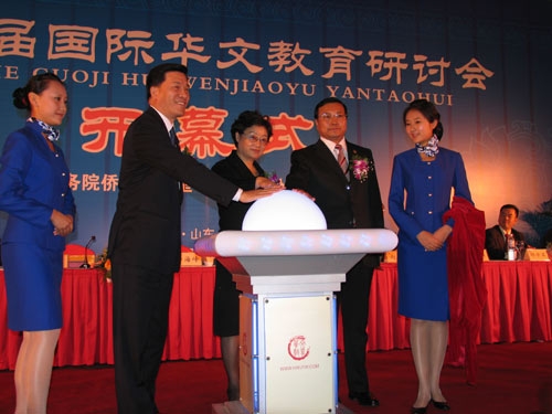 ????11月4日上午,第五届国际华文教育研讨会开幕之际,由国务院侨务办公室主办的“中国华文教育网(www.hwjyw.com)”隆重推出。国务院侨办主任李海峰、山东省副省长才利民、青岛市市长夏耕等共同点击触摸屏,宣布网站正式开通。