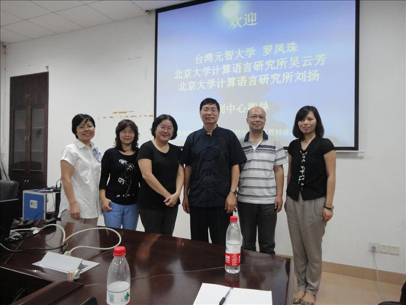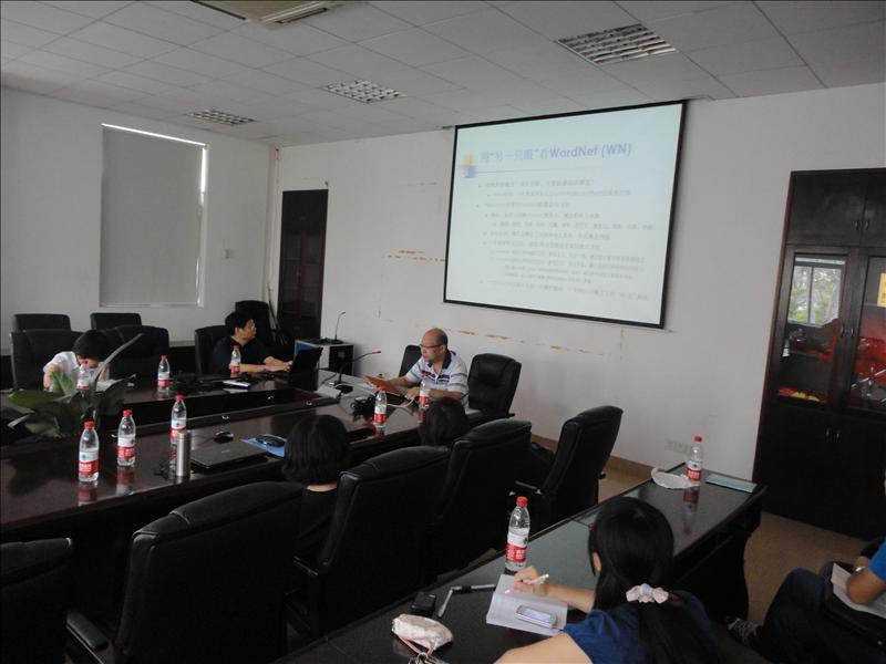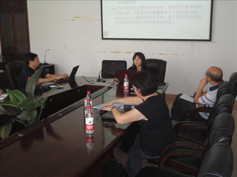 10月6号上午,台湾元智大学中国语文学系罗凤珠老师,北京大学计算语言学研究所吴云芳、刘扬等老师来我中心分别作了三场讲座,题目分别是《植基於詩詞文學特性的詩詞語言處理及研究之應用》、《基于大规模语料库的语义相似度计算方法》、《中文概念词典与词义问题探索》。出席人员主要有苏新春教授、郑泽芝副教授、李焱副教授、赵怿怡老师以及应用词汇学、对外汉语教学、计算语言学等方向的硕士、博士研究生。讲座由中心主任苏新春教授主持。我中心老师和同学们对三位老师的讲座内容都产生了浓厚的兴趣,因此也会不时打断三位老师的发言,提了一些大家很关心和疑惑的问题,三位老师也都一一作了回应。6号下午,苏新春教授作了题为《现代汉语类义词库建构及思考》的报告,主要是对义类词典的研制思路、过程、方法、遇到的问题等作了详细介绍,罗凤珠等三位老师也对苏教授的报告产生浓厚的兴趣,提了很多他们比较关注的问题,苏教授也都一一作了解答。整个讨论过程气氛比较热烈,展现出各位老师和同学对学术研究和讨论的极高热情。